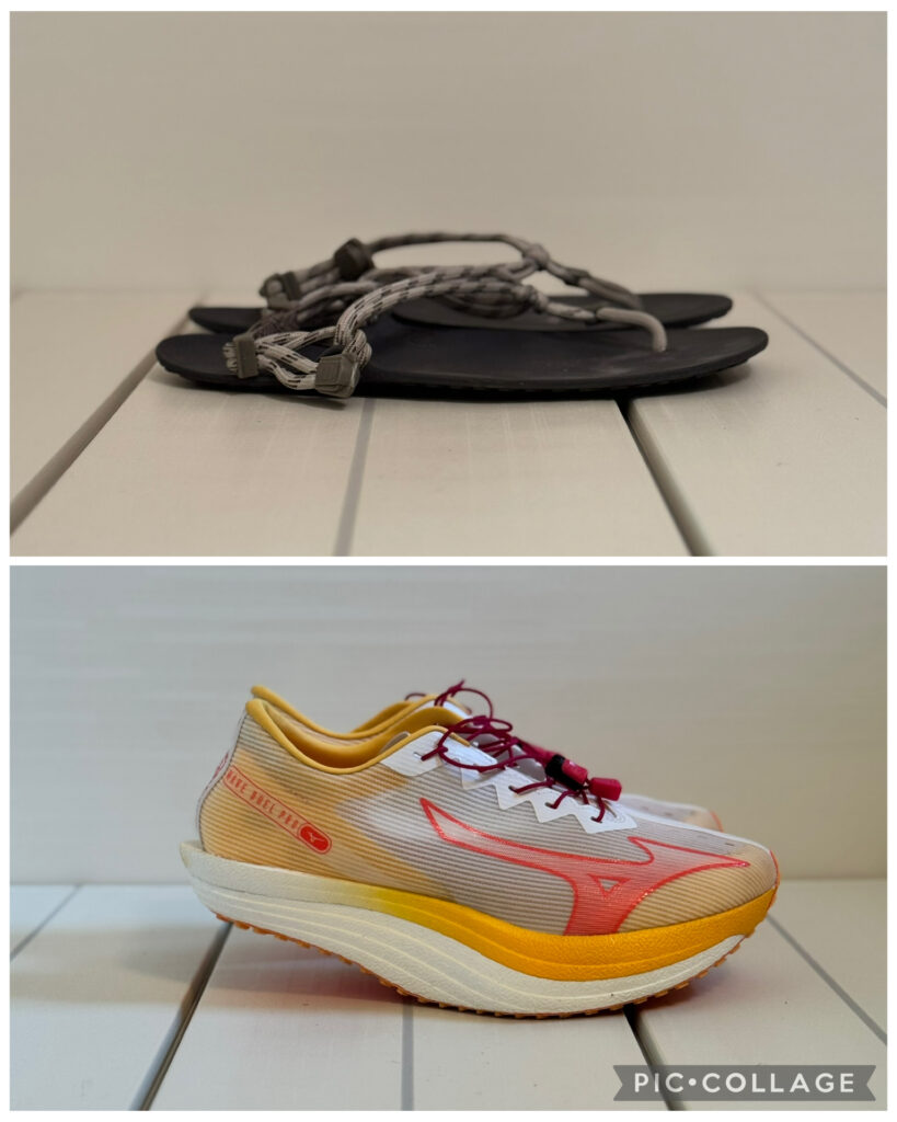 写真は、普段走る時に履いているサンダルと、先日坂路調教をした際の、シューズを並べたものですが、見ての通り、両極端な訳です。