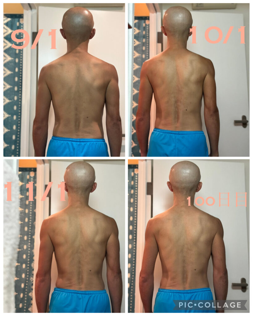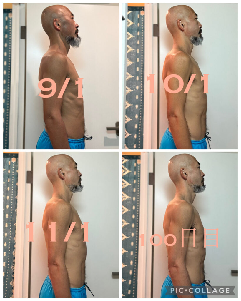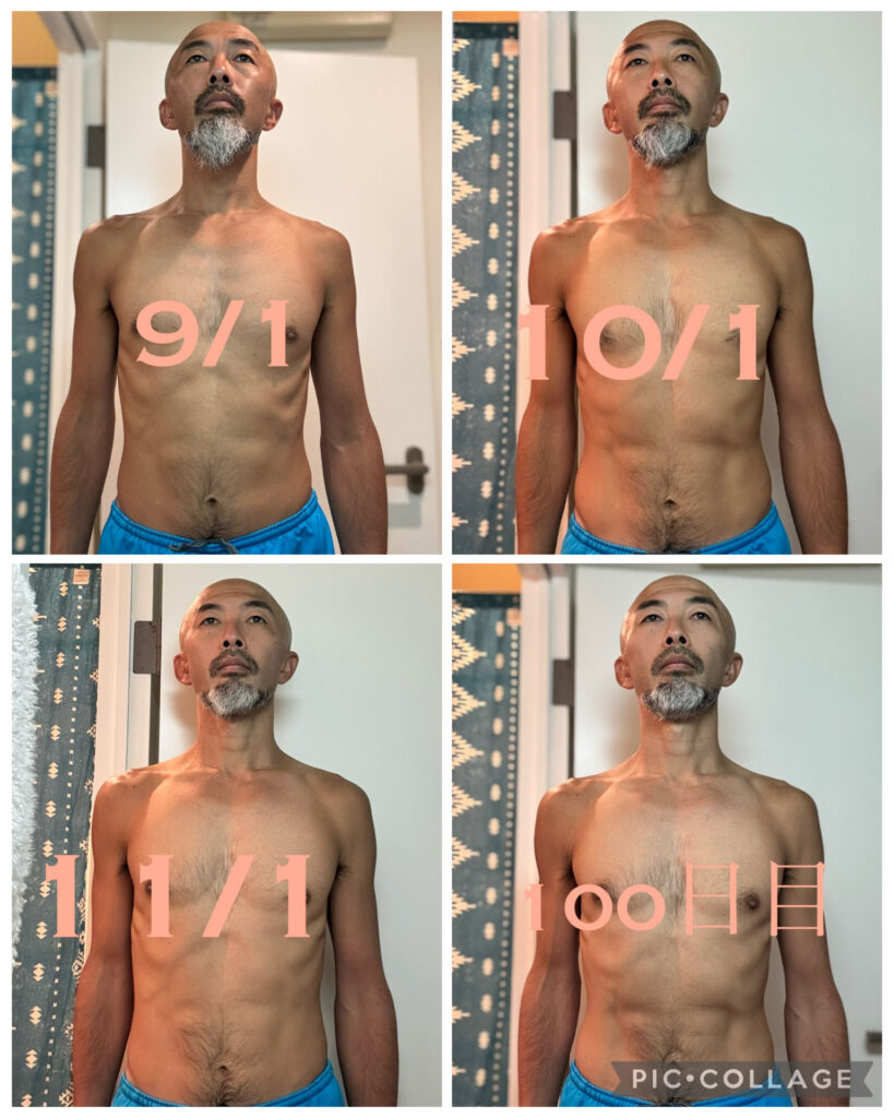 アップした写真は、9/1~100日目までのカラダの変化と、数値的な変化となります。