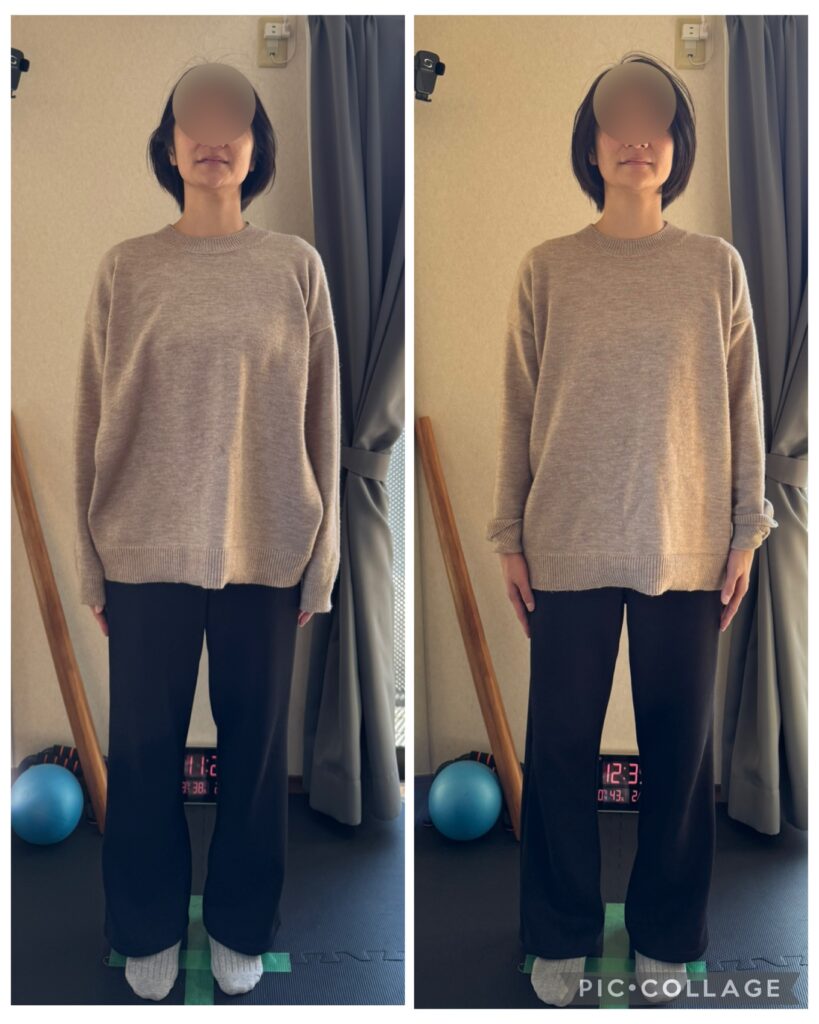 全身ストレッチをコンスタントに受けると、写真の方の様に、Before とAfter の差が少なくなって、スッと楽に立てる様になり、止まっている状態での柔軟性や、人のチカラを借りての柔軟性が、少しずつ上がって行きます。