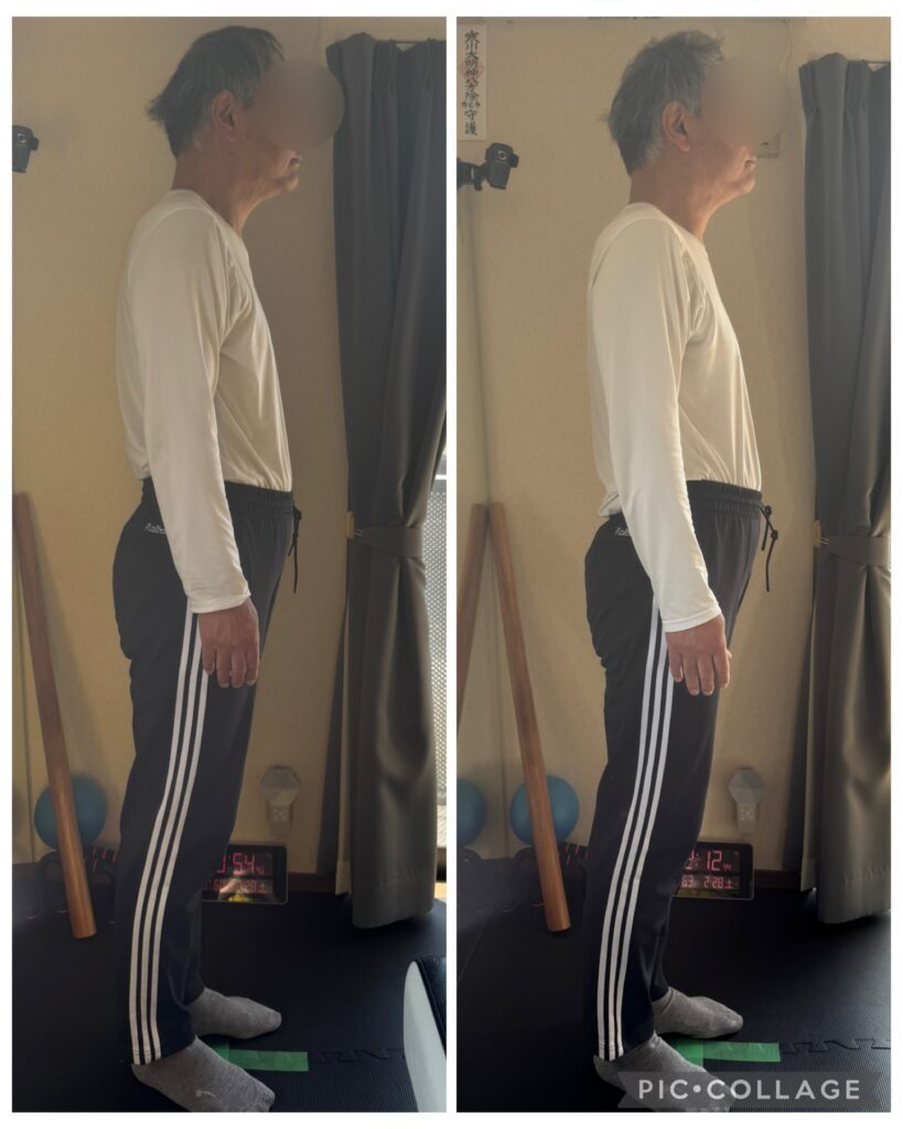 そうなると膝が曲がり、腹が縮まり、背骨のカーブが急激になり、顔が前に突き出て、肩も内に入って…と、負の連鎖が起こります。