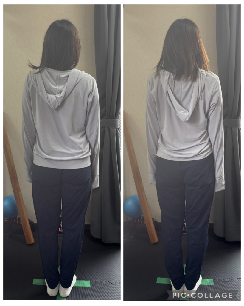 体調が落ち着いたら、全身ストレッチで姿勢をリセットして、右側の様な態勢で抱っこ出来る様になると、負担も減らせます。
